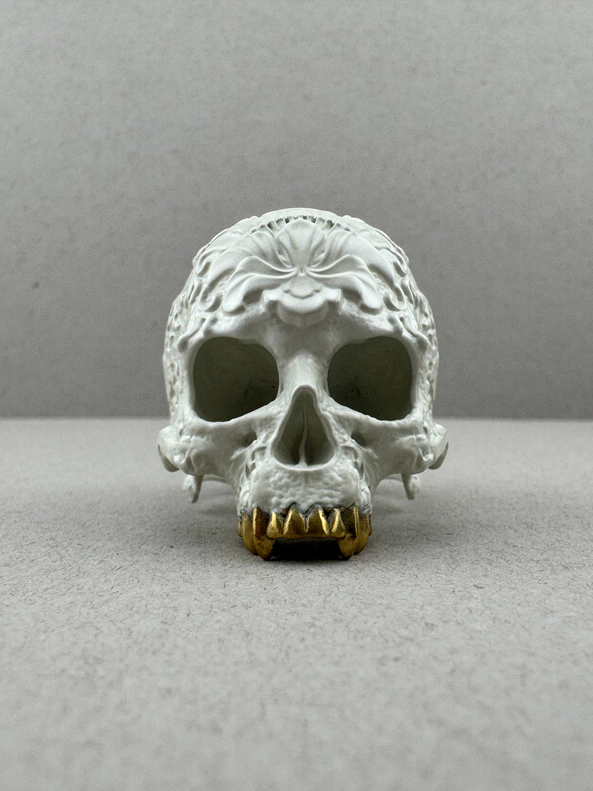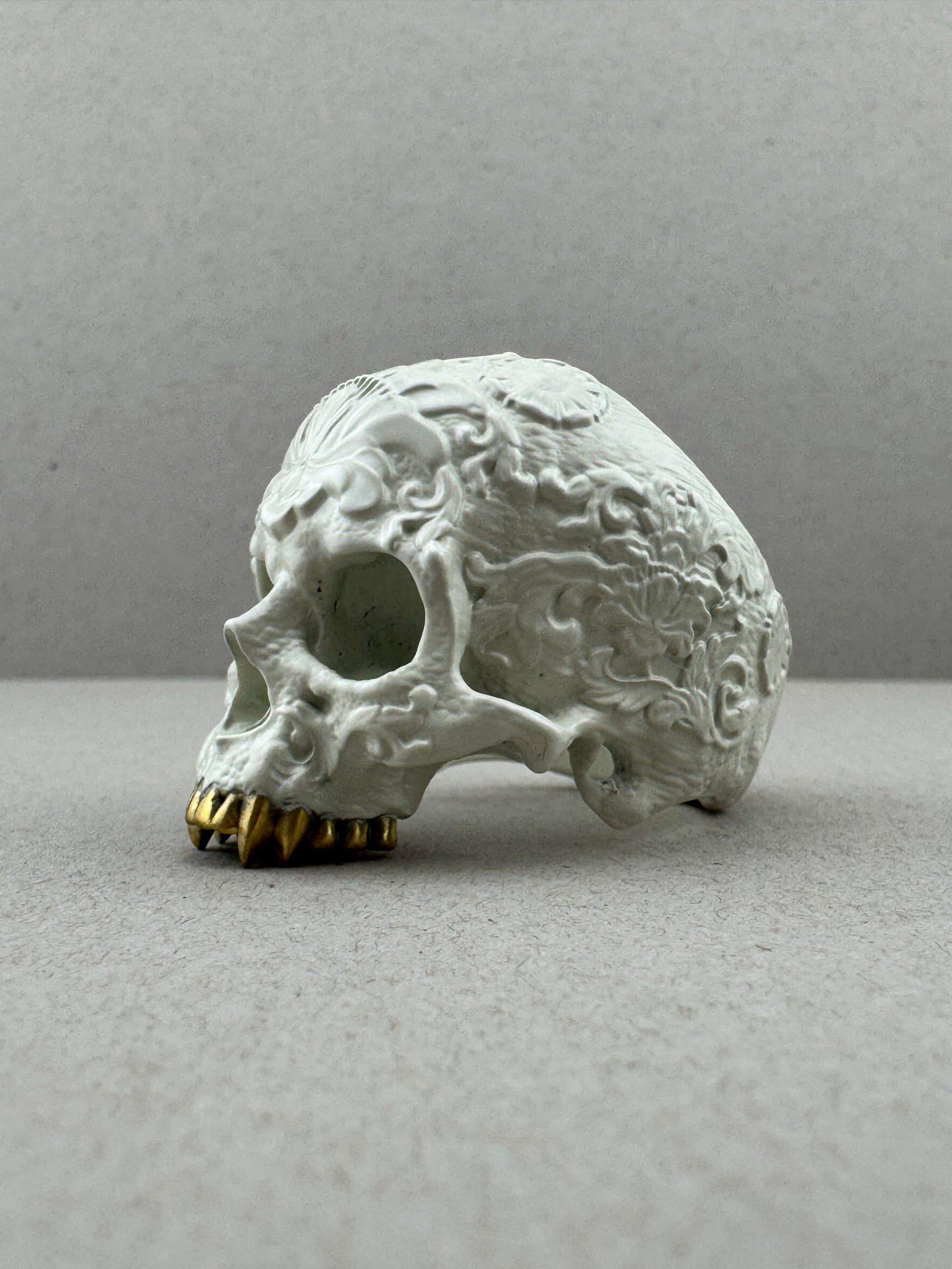 Sz14.5 White Ceramic on Brass Ornamental Skull Ring