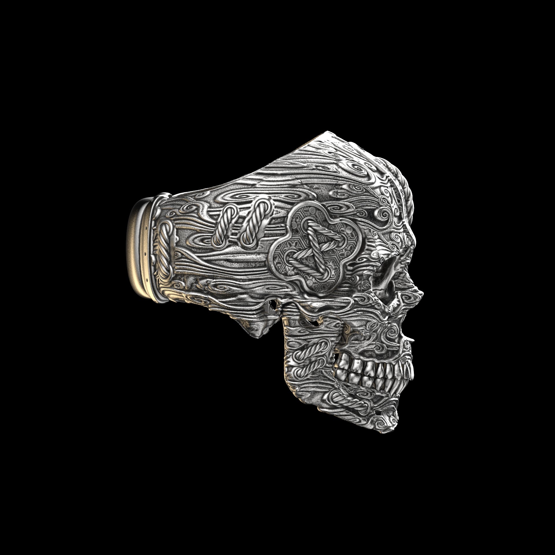 Diseño de anillo de calavera "Tied Wind", fundición de alta resolución y alto detalle en plata de ley.